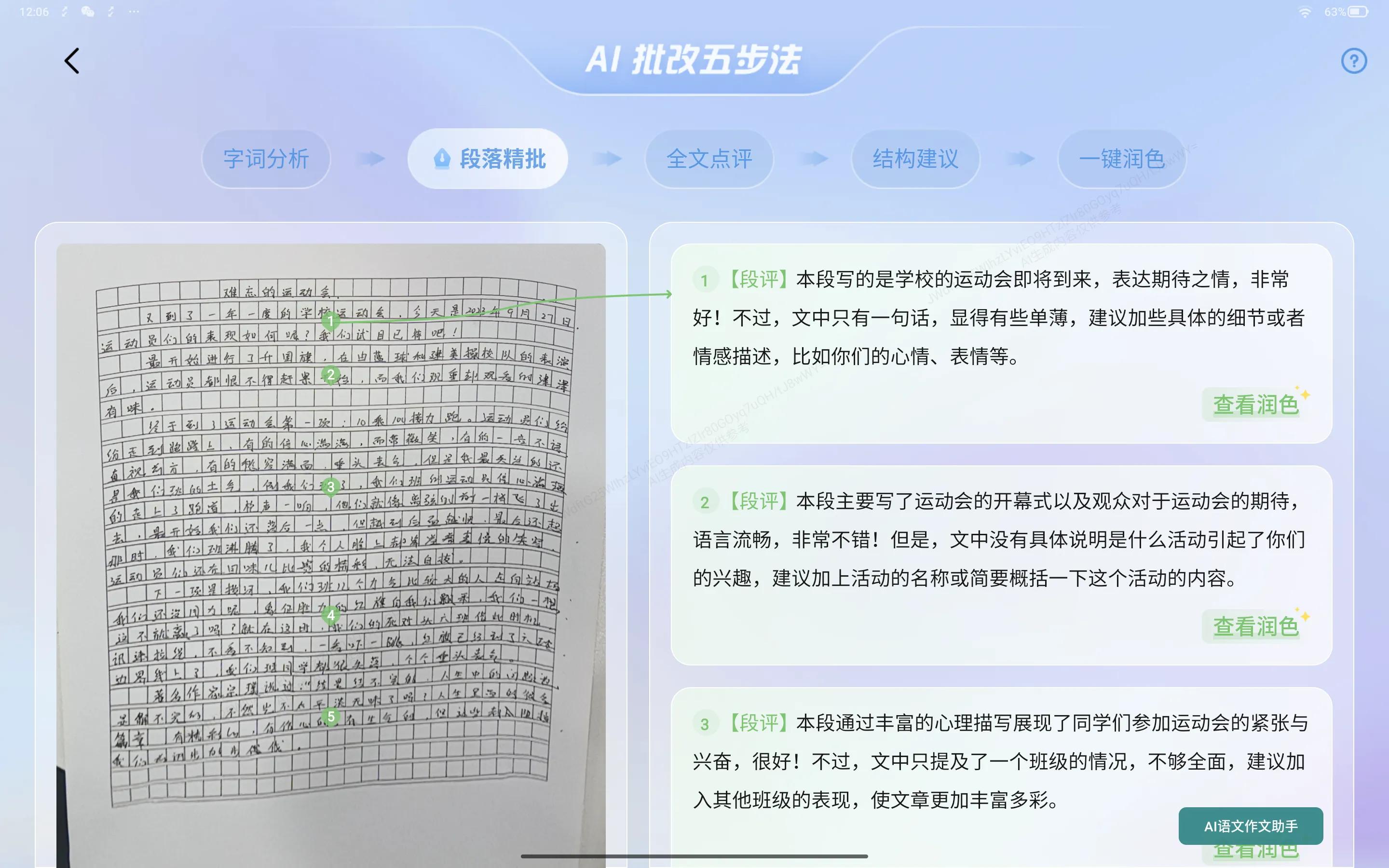 這一輪產品升級後,除了提供更好的交互體驗外,更重要的是將靈活度大大提升。以中文作文批改爲例,學而思讓大模型專項學習了教研老師提煉的“字、詞、句、段、篇”五步優化法,可以實現語文作文的一鍵潤色。