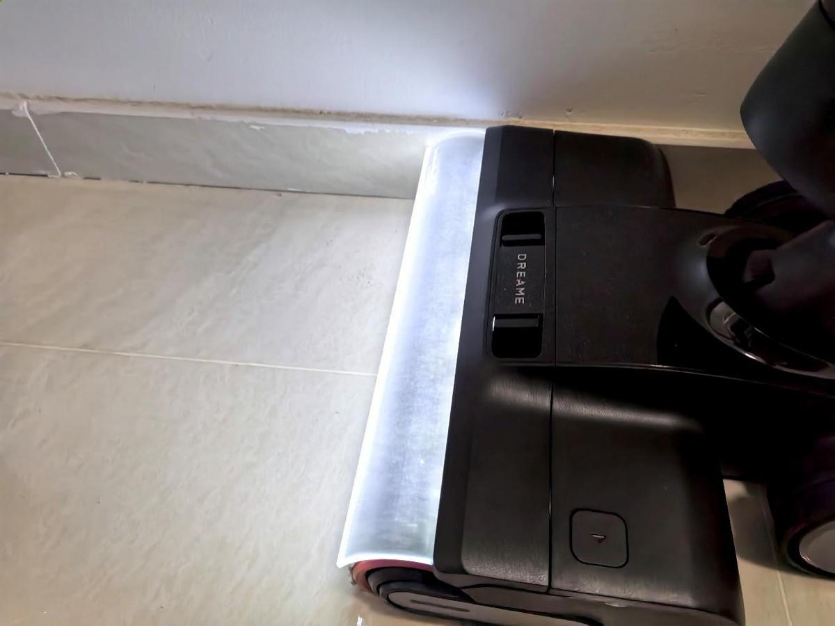 第二個問題就是洗地機在清潔地面時往往效果都不錯,但是家裏的犄角旮旯就成了衛生死角,所以洗地機的貼邊性也成爲消費者關注洗地機產品性能的重要指標。追覓H30的滾刷就採用了雙側零貼邊設計,能最大程度緊密貼合牆角、桌角、沙發腿等不易清理的拐角處,實際體驗中,可以看到滾刷幾乎已經貼在了牆壁上,牆邊的灰塵也都能夠清理的七七八八,減少了用戶再手動清理邊角的困擾。