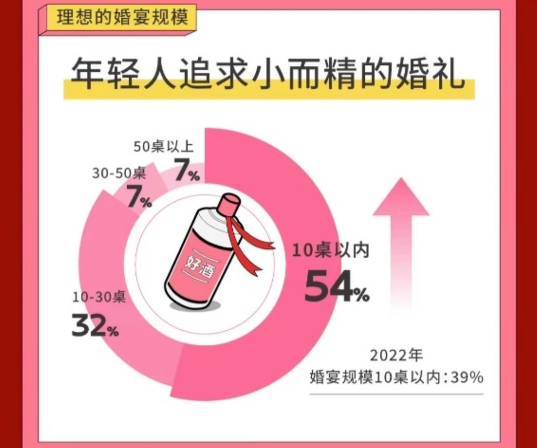 通過抽樣調查、數據分析等方式深入調研,《報告》發現,在所有受訪者中,選擇舉辦婚禮的人與2022年相比明顯提升,男性更是上漲近10%。同時,《報告》也顯示,年輕人期待的婚禮規模更趨輕量化,婚宴規模10桌以內成爲首選,並且他們更加註重個性化需求。