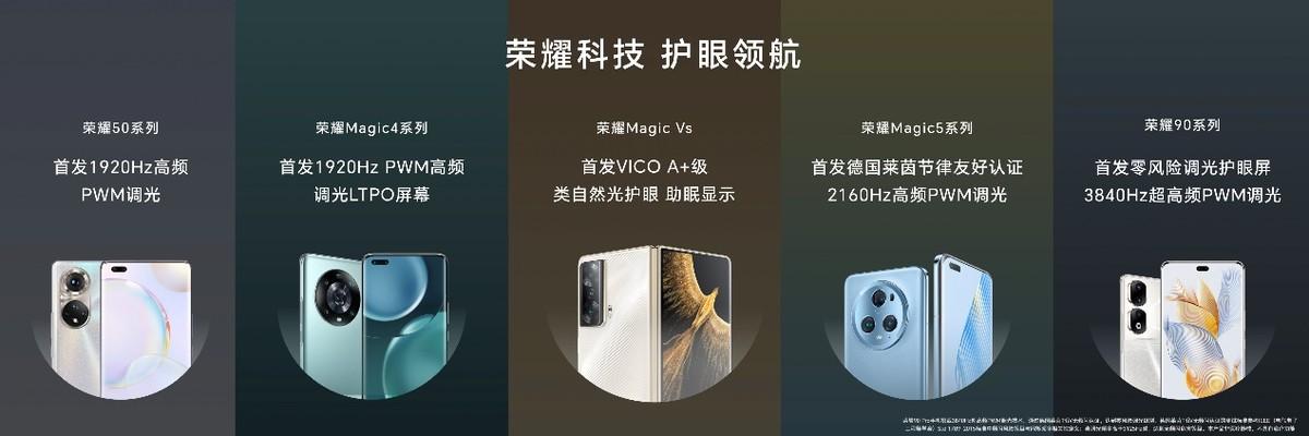 榮耀50系列首發1920Hz高頻PWM調光,榮耀Magic Vs成爲首款獲得中標院VICO A+舒適認證的手機,支持類自然光護眼及助眠顯示;榮耀90系列全球首發零風險調光護眼屏,支持 3840Hz 的超高頻 PWM 調光,通過德國萊茵TÜV無頻閃認證;此外,榮耀還擁有多項首創護眼技術和100餘項護眼專利,以大幅領先的護眼科技,爲行業提供高標準護眼範本。