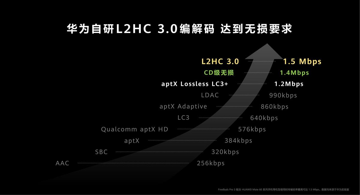 音頻信號的傳輸需要先在播放設備完成編碼,並在耳機端進行解碼。因此無損傳輸的實現還需要無損編解碼的“保駕護航”。華爲自研L2HC 3.0音頻編解碼協議,採用自研專利技術,保障在高碼率下對音頻文件進行流暢高效的bit級無損壓縮還原。配合麒麟A2芯片的傳輸能力,華爲FreeBuds Pro 3端到端實現了1.5Mbps無損傳輸。