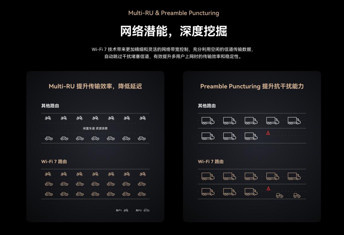 華爲路由 BE3 Pro在穩定性方面同樣出色。通過Wi-Fi 7的M-RU技術,可以將多個資源單位(RU)分配給單一用戶,充分利用空閒的信道來傳輸數據,相當於在一條水管工作壓力較大時,把隔壁閒置的水管也利用起來注水。再加持前導碼打孔技術(Preamble Puncturing),能夠自動跳過干擾堵塞的信道,相當於在原注水通道堵塞後,馬上會開闢一條新的臨時注水通道,雖然臨時通道可能效率沒有原有通道那麼高,但是不會出現斷崖式下跌的結果。