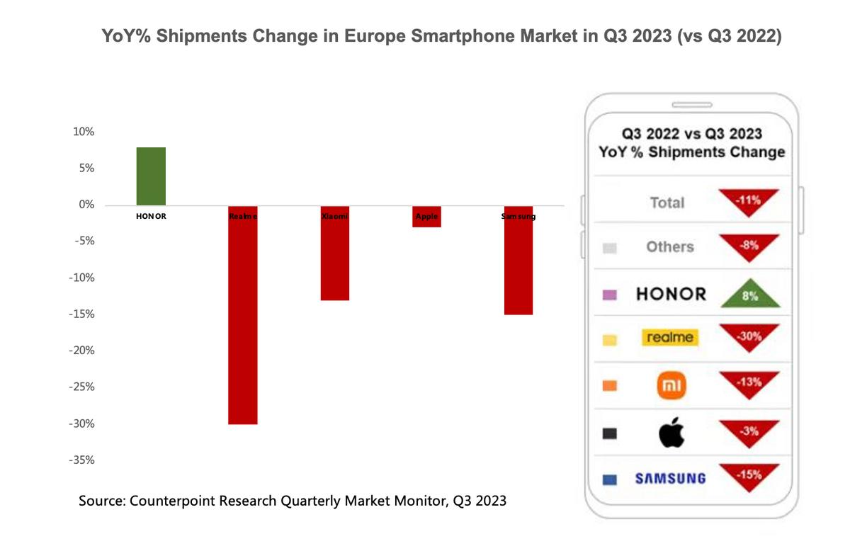 在海外高端市場,榮耀加碼佈局,實現“多點開花”。以歐洲市場爲例,Counterpoint數據顯示,在2023年Q3歐洲手機市場中,榮耀是全球唯一正增長的手機品牌。而根據GFK數據,榮耀旗艦機Magic系列受到歐洲用戶的認可,前三季銷量同比增長超300%。在不到10個月的時間,榮耀在法國、意大利、西班牙、羅馬尼亞多地實現3至7倍的增長。