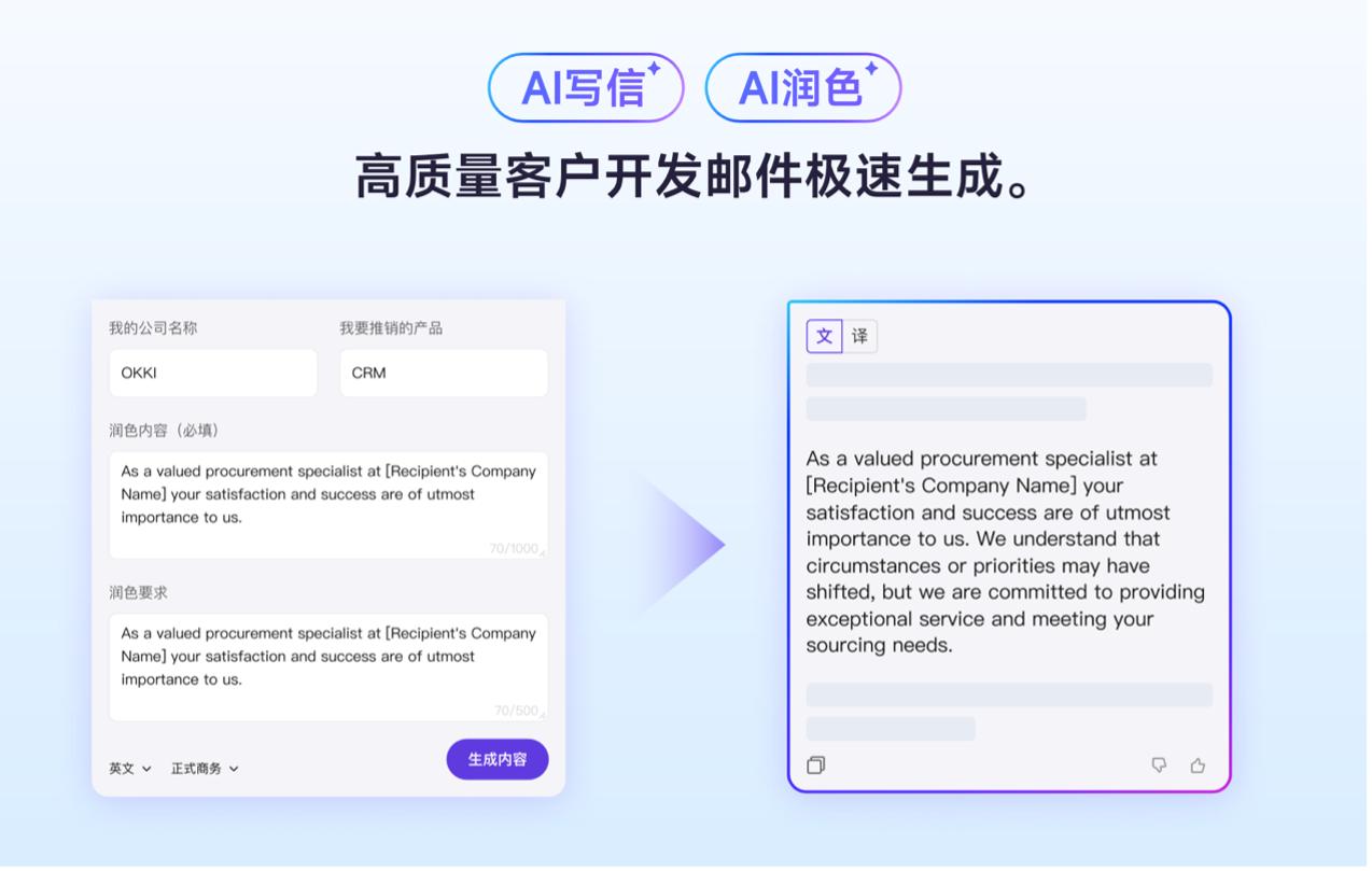 具體來說,外貿業務員只需輸入公司名稱、產品名稱、潤色內容,就可以一鍵生成高質量的客戶開發郵件,很多外貿業務員試用後覺得,這簡直是開發客戶時的“外掛”!