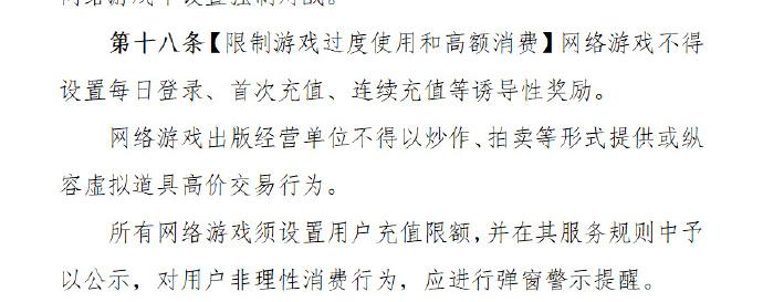 同時,網絡遊戲不得設置每日登錄、首次充值、連續充值等誘導性獎勵。網絡遊戲出版經營單位不得以炒作、拍賣等形式提供或縱容虛擬道具高價交易行爲。所有網絡遊戲須設置用戶充值限額,並在其服務規則中予以公示,對用戶非理性消費行爲,應進行彈窗警示提醒。