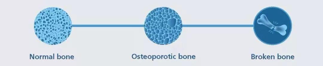 從左到右依次爲正常骨骼、骨質疏鬆的骨骼、骨折