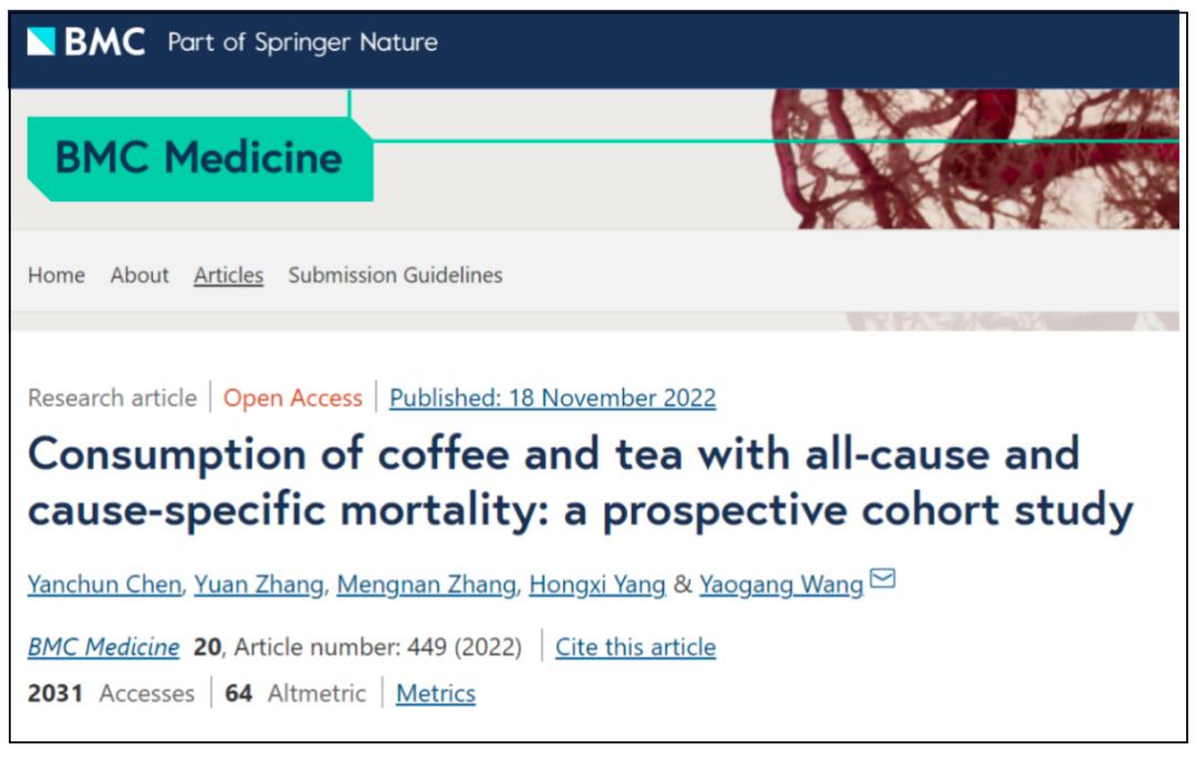 2022 年一項研究發現:與既不喝咖啡也不喝茶的人相比,每天喝 2~4 杯茶和<1~2 杯咖啡的人,具有更低的全因、心血管疾病和呼吸系統疾病死亡風險。