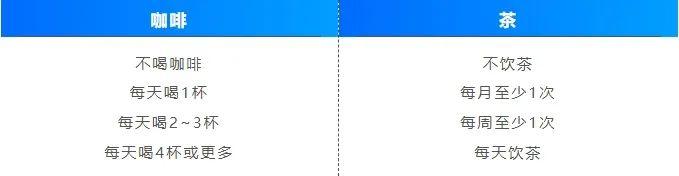 研究中一杯的標準分量爲 237 毫升。大部分(68.5%)的參與者每天喝咖啡,其中,52.9%的人每天喝 1 杯,42.2%的人每天喝 2~3 杯,4.9%的人每天至少喝 4 杯;36.7%的參與者不喝茶,39.4%的人每月或每週都會喝茶,23.8%的人每天喝茶。