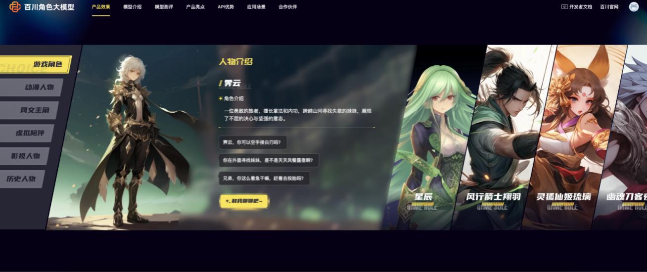 1月9日,百川智能發佈角色大模型Baichuan-NPC,深度優化了“角色知識”和“對話能力”,使模型能夠更好的理解上下文對話語義,更加符合人物性格地進行對話和行動。此外,對於遊戲領域AI角色開發成本高、週期長、自由度差、API不穩定等諸多不足, 百川智能推出了“角色創建平臺+搜索增強知識庫”的定製化解決方案。通過這一方案,遊戲廠商無需編寫代碼,只需通過簡單的文字描述,便可以快速構建出自己需要的角色,實現低成本、高效率的角色定製。