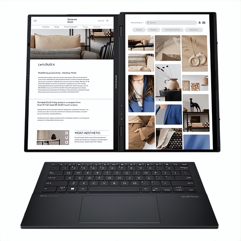 其中,華碩推出的Zenbook Duo雙屏筆記本電腦因其獨特的設計理念,從衆多產品中脫穎而出。這款電腦採用兩塊完全相同的14英寸OLED屏幕,分辨率高達2880x1800,縱橫比爲16:10,最大刷新率可達120Hz,雙屏最大可提供19.8英寸的可用屏幕面積,視覺體驗超越普通筆記本電腦產品。