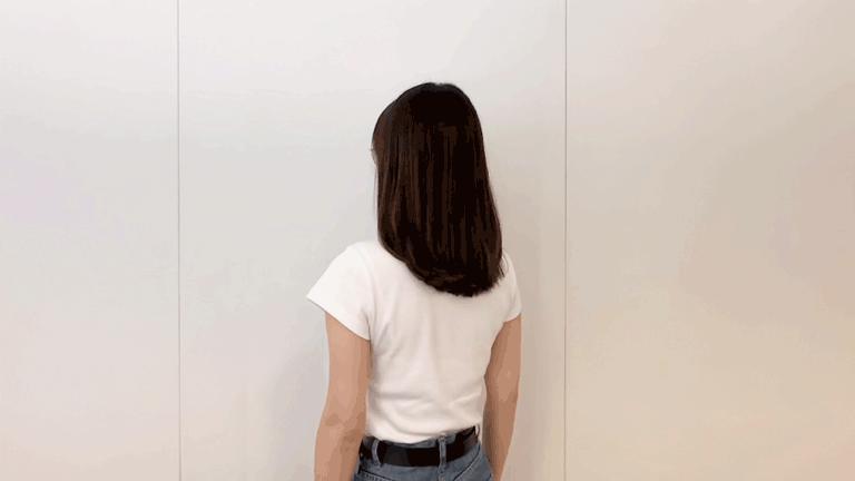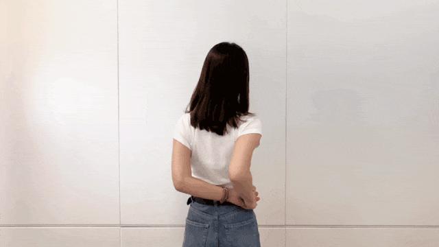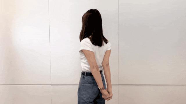 站立,雙手置於臀後十指交叉握拳,吸氣時胸部向前和向上,呼氣時伸直雙臂,雙手向下拉,將肩胛骨下沉,反覆練習數次。
