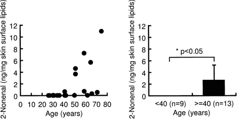 在一項日本的研究報告中顯示,在 40 歲及以上的人羣中才能檢測到這種物質,且隨着年齡增長、人體衰老,2-壬烯醛分泌量會加大,並在日常代謝中通過汗腺散發 。