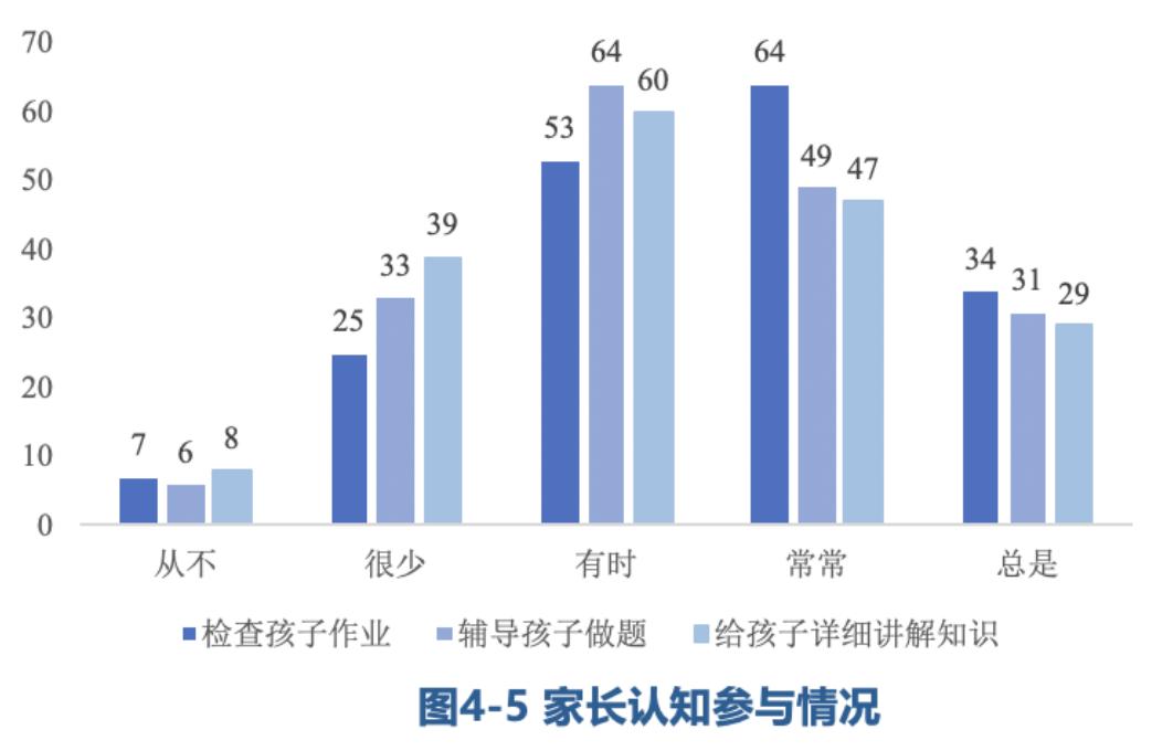 家長輔導孩子學習的參與行爲主要分爲檢查作業、輔導做題和詳細講解知識等類型。1/3的受訪家長主要集中在檢查作業層面,但也有約20%的家長從不或很少檢查作業,而輔導孩子做題的家長及給孩子詳細講解知識的家長比例則持續減少。調查結果顯示目前家庭教育方式主要爲“只說不教型”。