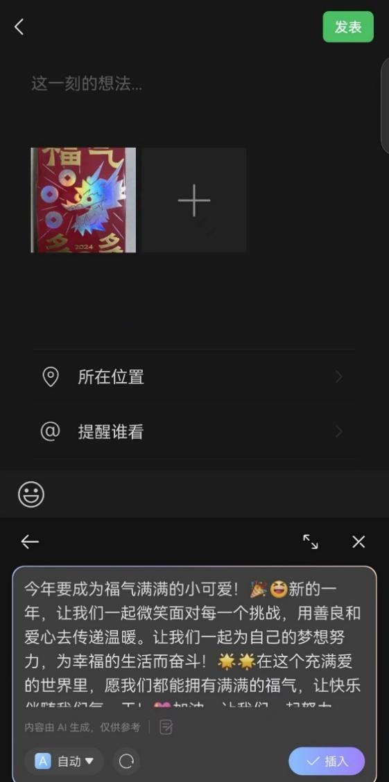 比如朋友圈中發一張圖片,想要表達一些感觸,但是奈何書到用時方恨少,無法直抒胸臆,這時候就能打開小藝輸入法的小藝幫寫功能,把自己的感受描述給小藝,小藝就能生成一段朋友圈文案。