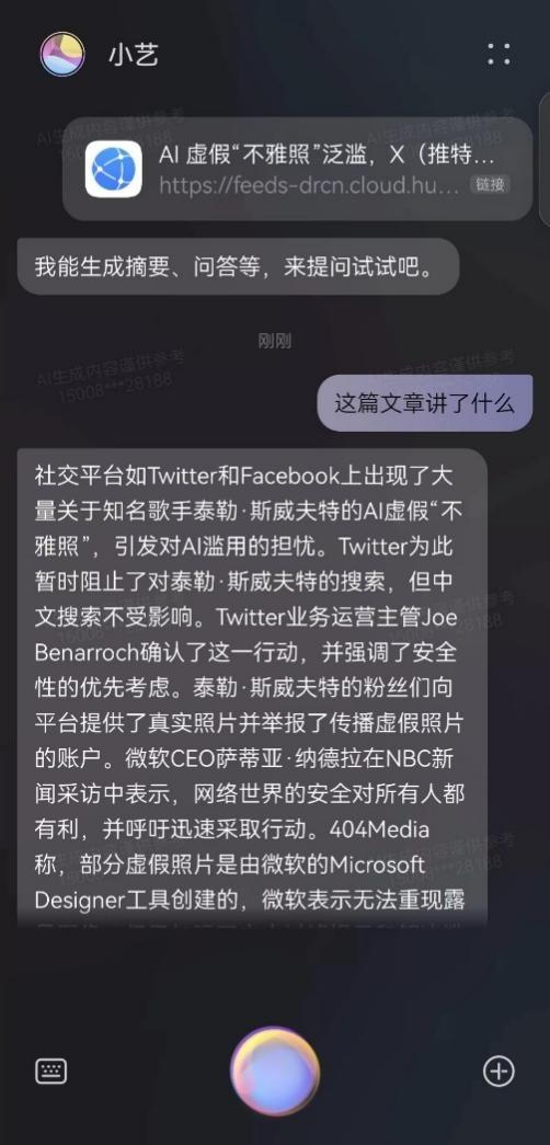或者當我們在一些內容資訊App上看到一篇文章,就可以直接喚起小藝問,“這篇文章主要講了什麼”,也可以把資訊鏈接發給小藝,此時小藝就可以快速對文章內容進行重點總結並生成簡短的摘要。如果我們想進一步瞭解,就可以根據摘要進行提問,這樣原本需要閱讀很長時間的文件,就能快速瞭解其核心內容,極大提升效率。