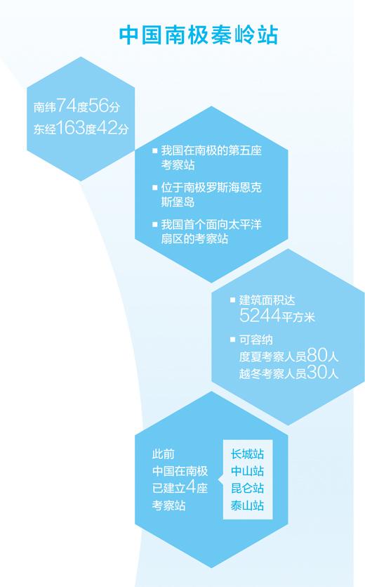 秦嶺站建築面積達到5244平方米,可容納度夏考察人員80人,越冬考察人員30人。這座新站的主體設計爲南十字星造型,設計理念源自中國航海家鄭和下西洋使用的南十字星導航。據瞭解,這是我國繼長城站、中山站之後第三個常年考察站,也是首個面向太平洋扇區的考察站。