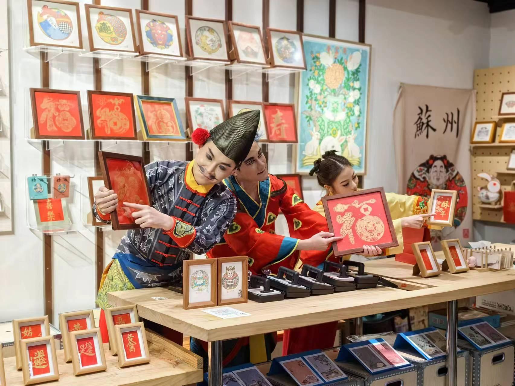 在蘇州美術館,龍年新春工藝美術特展上,蘇州市非物質文化遺產代表性傳承人喬麥在現場演示並邀請觀衆親手參與瞭解年畫製作的過程和技巧,大大增加了觀展的趣味性和互動性。
