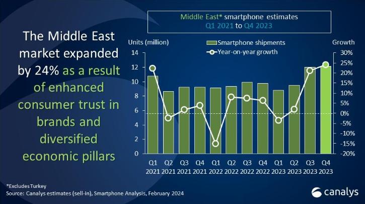 2月20日消息,市場研究機構Canalys近日發佈報告,揭示了2023年中東智能手機市場的強勁增長態勢。數據顯示,在2023年第四季度,中東地區(不包括土耳其)智能手機出貨量達到了驚人的1220萬部,較去年同期猛增24%。而在整個2023年,該地區智能手機出貨量更是攀升至4250萬部,與2022年相比實現了11%的顯著增長。