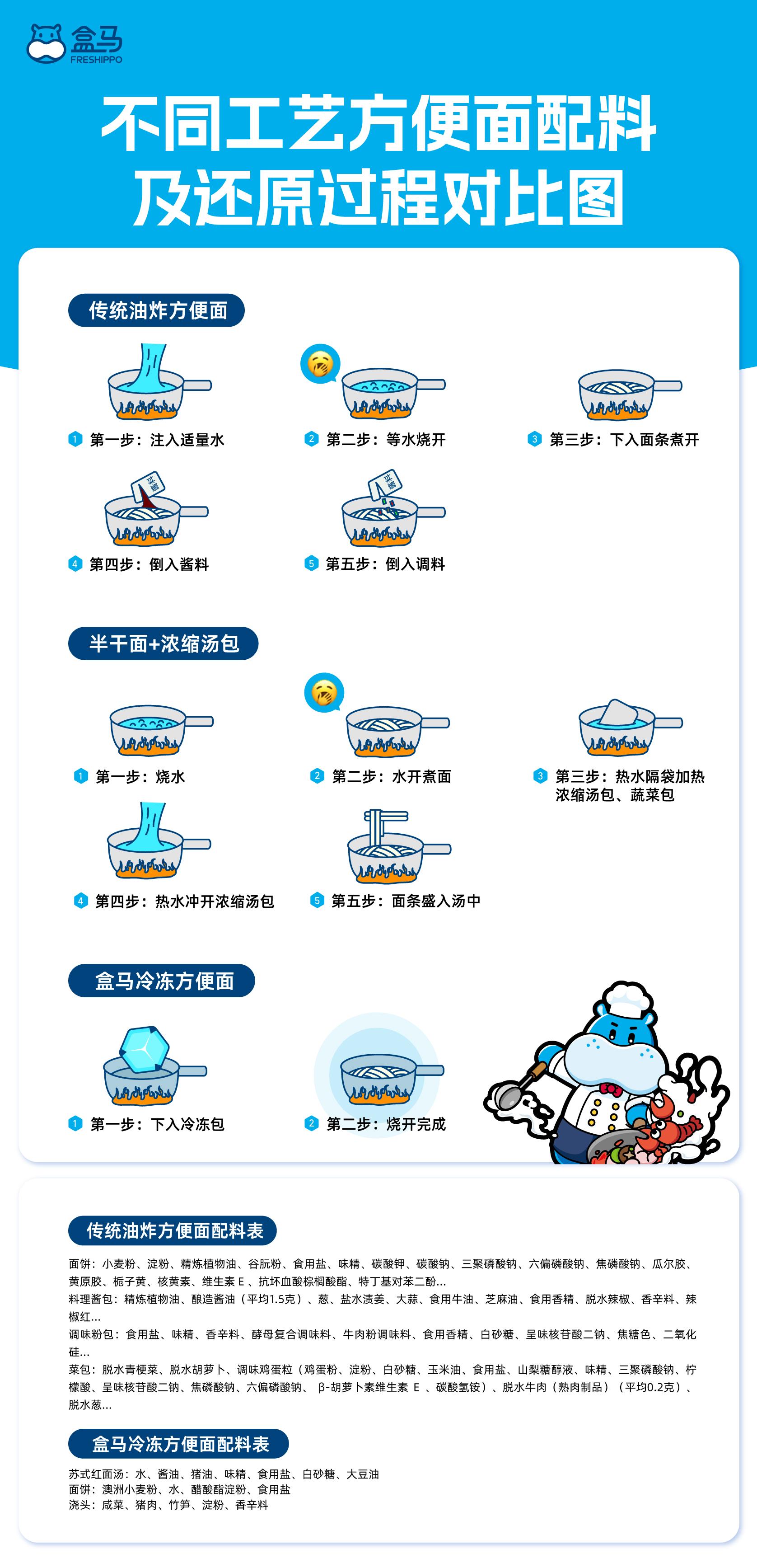 去年12月,盒馬上線不用加水、配料表乾淨的冷凍方便麪“殺入”方便麪賽道。昱夏介紹,首批上線的兩款冷凍方便麪,一款是大衆認知度很高的原味雞湯麪,一款則是蘇式面中接受度較高的鹹菜肉絲麪。