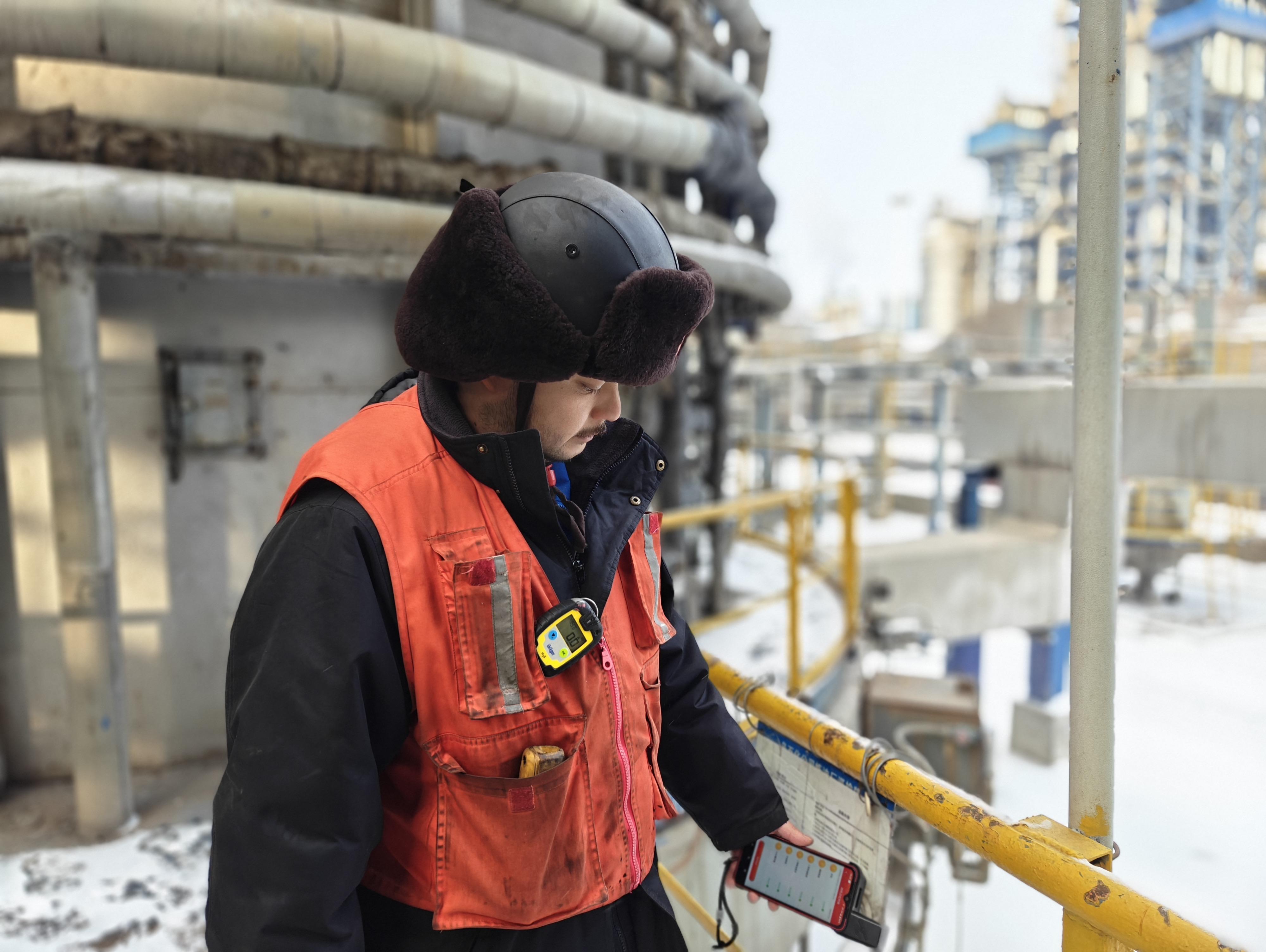 在近零下二十攝氏度的室外,記者遇到正在執行巡檢任務的煉油廠煉油二車間常壓運行一班班長劉成武,手持一個對講機大小的儀器,在裝置各個巡檢點前“打卡拍照”。