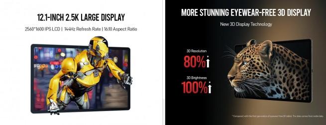 該平板利用AI技術解決了3D內容不足的問題。上一代產品也配備了2D轉3D轉換器,但全新的Neovision 3D Anytime功能更加強大。它適用於圖片、視頻(包括流媒體)甚至遊戲。這款12.1英寸的IPS LCD屏幕擁有2560 x 1600像素的分辨率(16:10)和144Hz的刷新率,配備了液晶透鏡,承諾將3D分辨率提高80%,並將3D模式下的亮度提高一倍。此外,它還減少了3D串擾,並改善了3D色彩和能效。