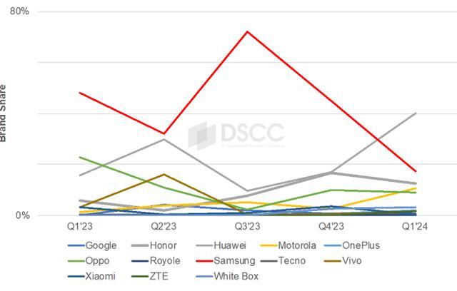DSCC分析師認爲,這個低谷期將爲華爲提供一個難得的超越機會。基於華爲Mate X5和Huawei Pocket 2兩款機型的成功表現,華爲有望在2024年第一季度實現市場份額的暫時領先。此外,由於華爲採用BOE顯示屏,這也可能助力BOE在顯示屏市場超越競爭對手三星Display。
