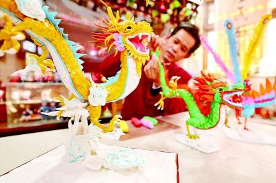 山東省臨沂市沂南縣紅石寨非物質文化遺產博物館,麪塑藝人在展示生肖龍麪塑作品。新華社發