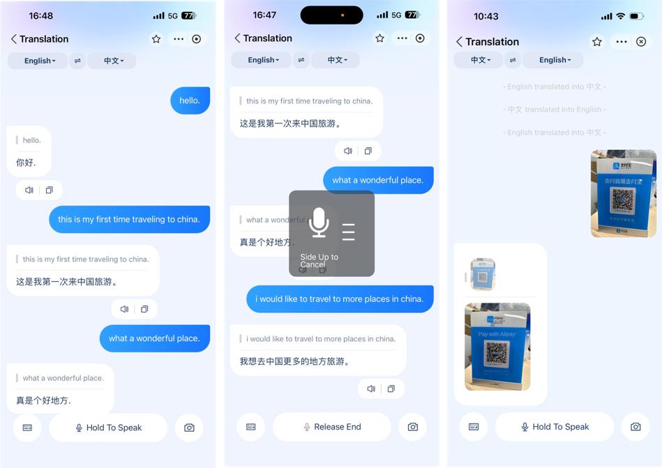爲方便外籍用戶交流,支付寶“翻譯”工具無需搜索,直接在支付寶App首頁可用。自帶文字翻譯、語音翻譯、拍照翻譯3種方式,方便日常交流。