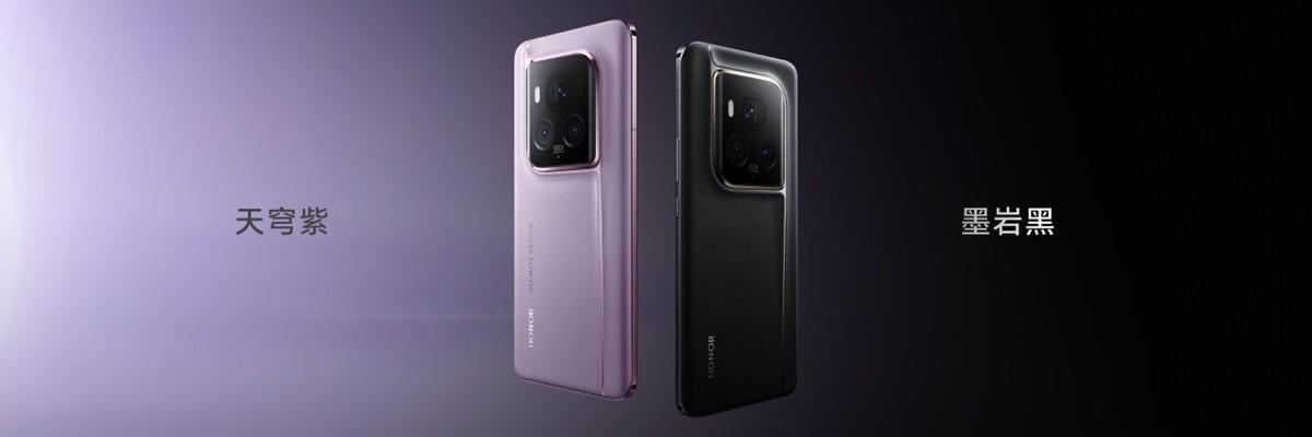 本次發佈的旗艦新品榮耀Magic6 至臻版,在外觀設計上更爲奢華和大氣,從祁連天池汲取設計元素,搭配流溪飾帶、雙縫線以及高端工藝皮紋;配色上,從祁連山脈和川西祕境中獲得靈感,推出了天穹紫和墨巖黑兩種配色。