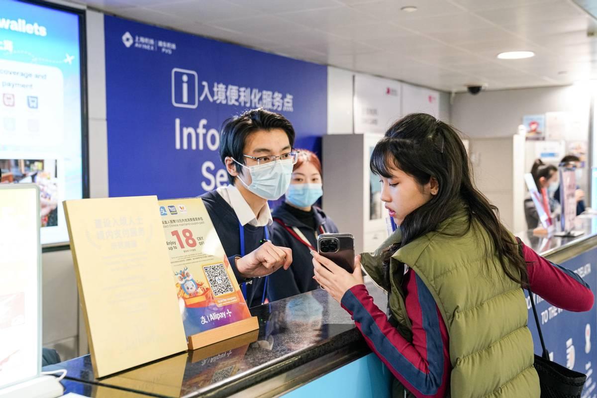 “移動支付會便利入境旅客在華的居住、生活、工作、遊玩等方方面面的體驗。今年隨着多國的雙向免籤政策利好,我們服務檯每天接待諮詢平均在30多單,高峯可以達到50單”,Alipay+浦東機場服務檯現場負責人袁泉說。2023年上海進博會前,在中國人民銀行上海分行、市金融局、市商務委、市交通委等單位支持下,上海機場集團聯合螞蟻集團率先在浦東機場設立了入境便利支付體驗服務檯,提供雙語服務方便境外賓客在落地“第一公里”,就能“入鄉隨俗”,瞭解到怎麼用移動支付。