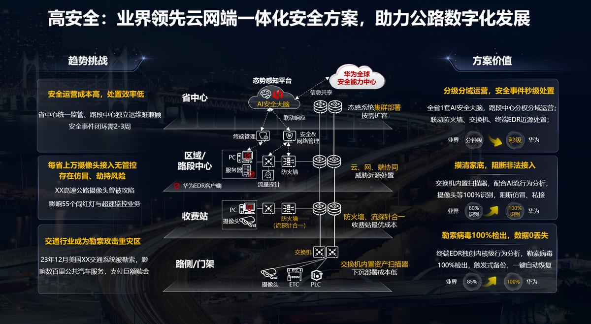 在政策引導和技術進步的雙重推動下,智慧高速建設正以前所未有的力度向數字化、智能化、低碳化、可持續化的方向邁進,以滿足高速公路建設、運營、管理、養護、安全保障的一體化需求。隨着道路信息感知精度不斷提升,收費模式不斷創新,以及海量設備接入帶來的網絡安全與運維挑戰加劇,高速公路網絡的可靠性與安全性面臨更爲嚴峻的考驗。華爲憑藉多年在公路交通領域的深入耕耘,適時推出了全新的Net5.5G智能交通網絡解決方案,致力於爲中國高速公路的數字化通道鋪設穩固的網絡基石。