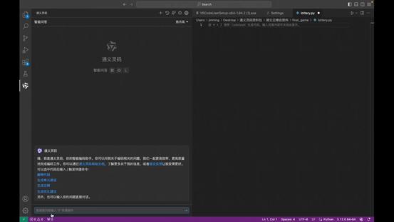 以用 Python 編寫一段抽獎遊戲程序爲例,在編輯器(以下圖示VSCode)中,通過自然語言描述抽獎遊戲的功能和獲獎規則,通義靈碼即可根據描述和上下文,在編輯器區直接生成代碼及相關注釋。將通義靈碼生成的代碼,一鍵插入或複製代碼到創建的文件中,點擊運行,就可以在Python模塊中看到符合要求的抽獎遊戲效果,整個過程只需幾分鐘即可完成。
