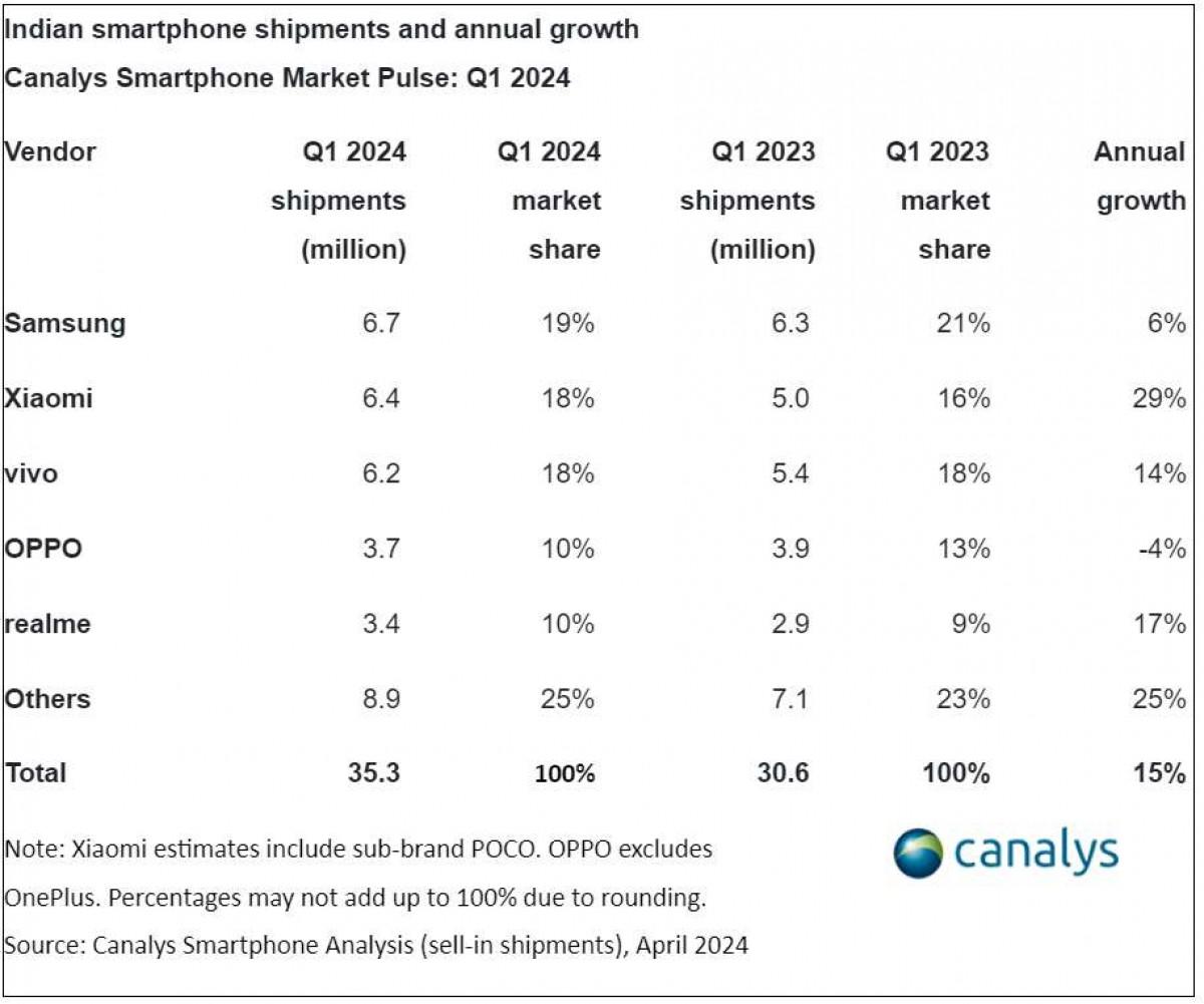 【環球網科技綜合報道】4月21日消息,近日,據市場研究機構Canalys最新發布的報告,2024年第一季度,印度智能手機市場表現出強勁的增長勢頭。在這個競爭激烈的市場中,三星、小米和vivo等頂級品牌展開了激烈的角逐,且三者之間的市場份額相差無幾,形成了三足鼎立的局面。