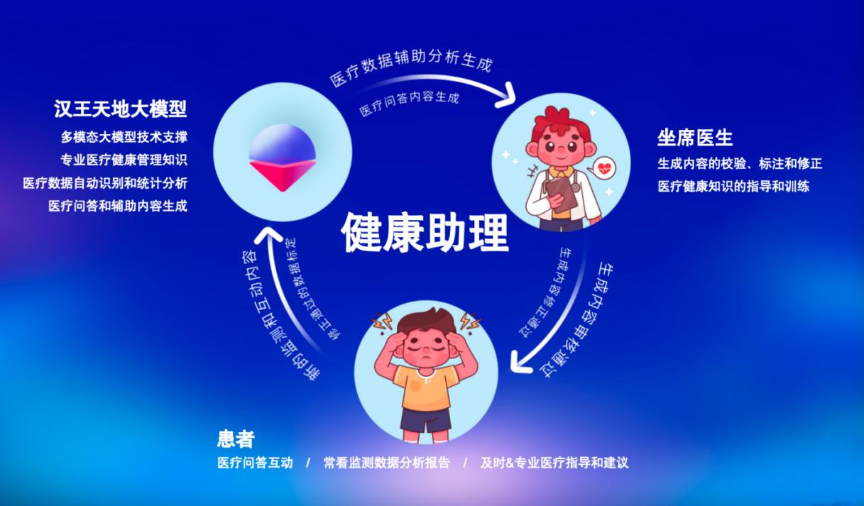 漢王科技通過大模型構建了健康助理,基於準確的血壓監測數據,將“醫養大模型-醫生-患者”打造爲三位一體的醫患共同體。在這個閉環中,藉助自研的醫養大模型的醫療專業知識、多模態輸入輸出、智能分析和專業生產能力,通過患者諮詢問題和醫療數據分析,提供個人健康管理建議和醫療數據輔助分析建議。