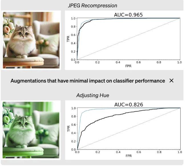 此外,當圖像經過修改後,該工具的鑑別能力也會受到影響。對於諸如裁剪、壓縮和飽和度變化等微小修改,工具的成功率雖然有所下降,但仍保持在95%至97%的可接受範圍內。然而,當圖像經過色調調整後,成功率驟降至82%。對於經歷更廣泛變化的圖像,該工具在分類時更是遇到了明顯的困難,OpenAI甚至未公佈這些情況下的成功率。