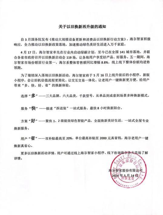 據瞭解,5月14日,海爾智家發佈了《關於以舊換新再升級的通知》,通過升級更好的服務和權益,讓綠色美好生活深入更多用戶家庭。爲此,海爾智家在5月16日上線了新版以舊換新小程序;5月17日,再與政府聯合啓動全國消費品以舊換新行動……一系列的落地舉措,都只爲讓用戶享受到“多、快、好、省”的煥新體驗。